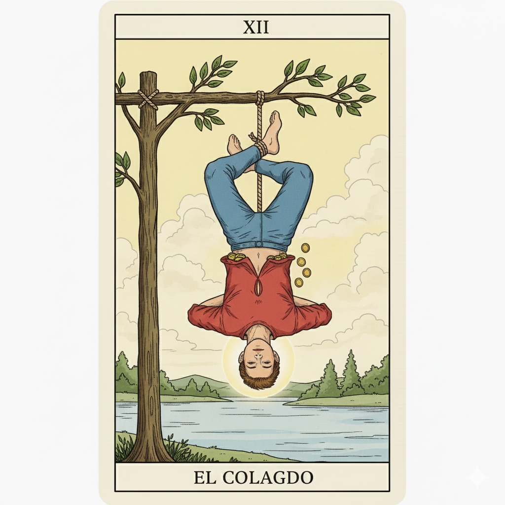 El Colgado invertido advierte sobre resistencia a soltar, negación de la necesidad de pausa o sacrificios inútiles que no llevan a ninguna parte. Puede indicar que estás luchando desesperadamente contra circunstancias que están fuera de tu control, agotándote sin lograr nada. También puede señalar victimización, martirio o hacer sacrificios excesivos que nadie te pidió hacer. Tal vez estás atrapado en una situación difícil sin poder ver opciones o perspectivas alternativas. Esta posición también puede advertir sobre egoísmo extremo, negarse a hacer sacrificios necesarios o aferrarse a control cuando deberías soltar. Por otro lado, puede indicar que ya cumpliste tu tiempo de espera y es momento de actuar, pero estás quedándote en la zona de confort de la inacción. El consejo es examinar honestamente si estás resistiendo cambios necesarios, haciendo sacrificios que no sirven a nadie o simplemente necesitas cambiar radicalmente tu perspectiva sobre la situación.