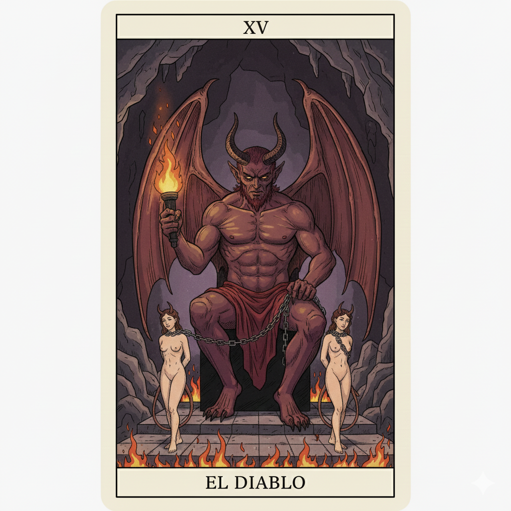El Diablo representa las cadenas invisibles que tú mismo has forjado: adicciones, patrones tóxicos, relaciones codependientes, obsesiones materiales o miedos paralizantes. Esta carta no es malvada; es espejo oscuro que refleja tu sombra, la parte de ti que has negado o reprimido. El Diablo aparece cuando estás atrapado en patrones destructivos pero crees no tener poder para cambiar, cuando tus deseos te controlan en lugar de tú controlarlos a ellos. Sin embargo, observa las cadenas en la carta tradicional: son flojas. Puedes quitártelas en cualquier momento, pero has olvidado que eres libre. Esta carta te confronta con tus propios demonios, adicciones y dependencias, preguntándote: ¿qué placeres aparentes te mantienen esclavizado? El Diablo también representa sexualidad cruda, poder material, ambición sin ética y el aspecto animal de la naturaleza humana. No es sobre eliminar estos aspectos sino integrarlos conscientemente. El primer paso hacia la liberación es reconocer honestamente dónde estás encadenado.