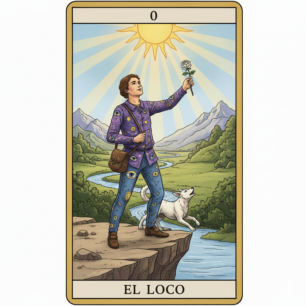 El Loco tradicionalmente se representa caminando hacia el borde de un acantilado, con una pequeña mochila que contiene todo lo esencial y un perro blanco (su intuición) que le acompaña. Su mirada está dirigida al cielo, no al suelo, simbolizando fe en lugar de miedo. La rosa blanca representa pureza de intenciones, mientras el sol brillante en el fondo augura éxito. El acantilado no es peligro sino oportunidad: el salto cuántico hacia una nueva dimensión de existencia. Los colores brillantes de su vestimenta muestran optimismo y alegría de vivir.