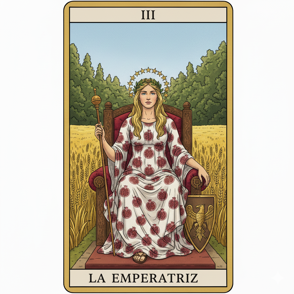 La Emperatriz se sienta en un trono lujoso en medio de un campo fértil lleno de trigo maduro, simbolizando abundancia y cosecha. Su vestido está decorado con granadas (fertilidad) y Venus, diosa del amor. La corona de 12 estrellas representa su dominio sobre los 12 meses del año y los ciclos naturales. El río fluyendo en el fondo simboliza emociones saludables y flujo de abundancia. El bosque verde exuberante detrás de ella representa crecimiento natural y vida próspera. Su cetro representa su poder femenino y autoridad amorosa. Los colores cálidos y abundancia de elementos naturales enfatizan su conexión con la Madre Tierra.