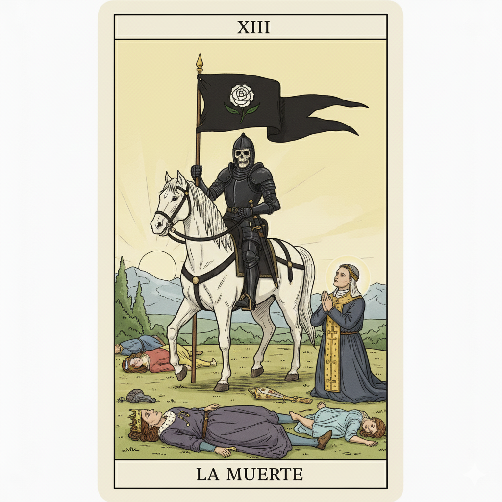 La Muerte cabalga un caballo blanco (pureza del proceso) con armadura negra representando lo inevitable e impersonal de la transformación. Lleva una bandera negra con una rosa blanca (belleza que florece de la descomposición). Bajo los cascos del caballo yacen figuras de todas las clases sociales (rey, obispo, niño, mujer) mostrando que la muerte/transformación no discrimina. El sol se pone entre dos torres (el final de un ciclo), pero también promete amanecer futuro. El río que fluye representa continuidad de la vida a través de cambios. Las figuras muertas no están descompuestas sino dormidas, simbolizando que la muerte es transición, no final absoluto. Los barcos en el río aguardan para llevar almas al otro lado. Todo en esta carta comunica que la muerte es parte natural del ciclo eterno, no algo a temer sino a honrar.